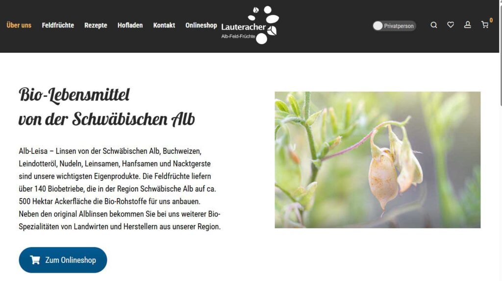 Linsen von der Schwäbischen Alb ist unsere eingetragene Marke. Seit 1985 werden die Speiselinsen wieder regional angebaut. Seit 2013 haben wir unser Lauteracher Alb-Feld-Früchte Sortiment neben unseren Alblinsen mit weiteren nach den Öko-Richtlinien von Bioland-Zertifizierten Feldfrüchten, wie Leindotter, Buchweizen, Leinsamen und Hanfsamen erweitert.